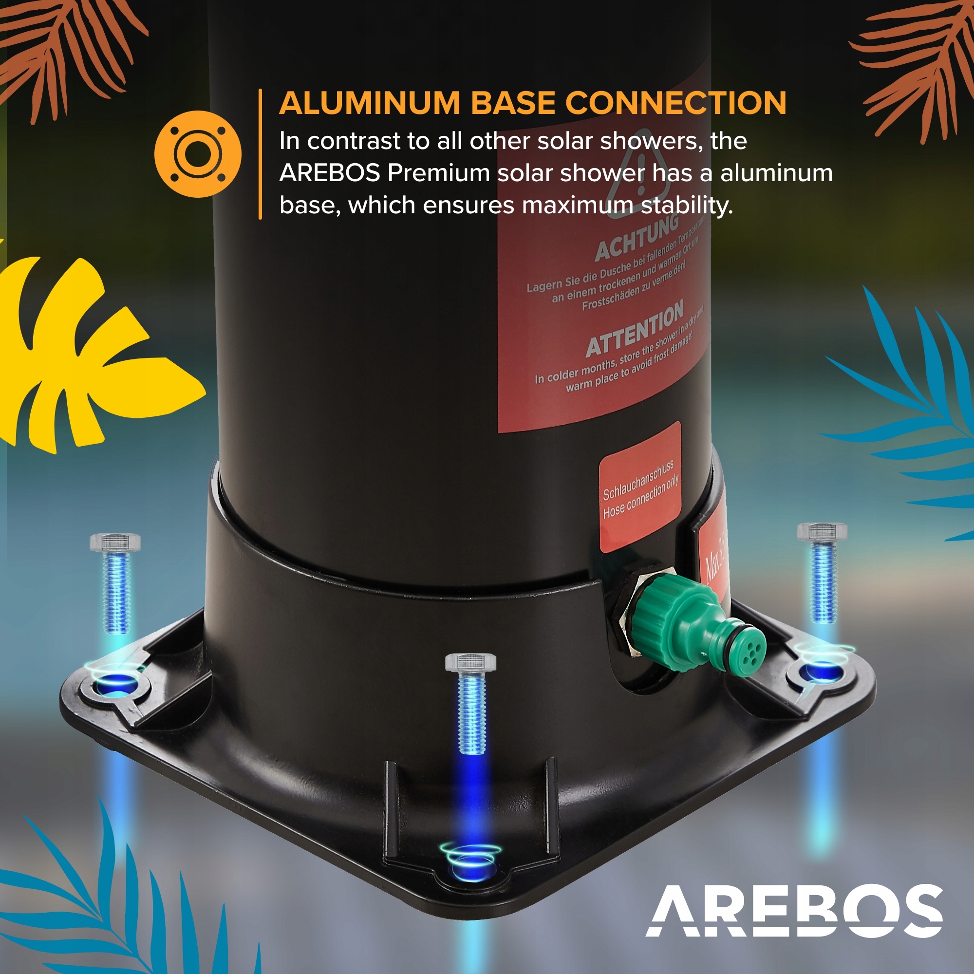 В отличие от других солнечных душей, у которых отсоединяется пластиковая ножка, модель премиум-класса от AREBOS имеет прочную алюминиевую ножку, которая гарантирует стабильное и надежное удержание солнечного душа.