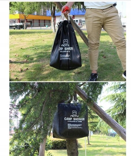 Ненаполненный душ легок и занимает мало места - его можно легко поместится, например, в рюкзак. Душ можно подвесить на любой выступающий устойчивый элемент - например, ручку, стержень, трубу или даже ветку дерева (однако учтите, что полностью наполненный водой душ может весить немало - выбирайте места для подвешивания, соответствующие количеству наливаемой воды).