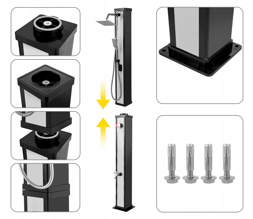 МОНТАЖ - Этот душ оснащен двухсекционными колоннами. Все оборудование включено в комплект поставки для легкой установки. Примечание. Чтобы сделать душевую колонну более устойчивой, установите ее на цементную или другую твердую поверхность.