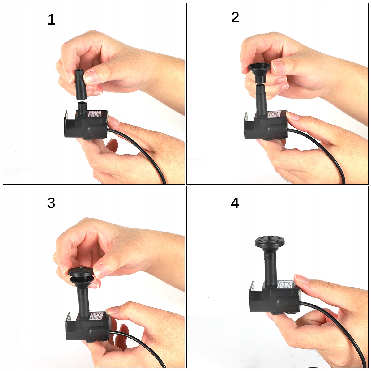 ⛲1. Поместите насос полностью в воду и его сопло за водой; Убедитесь, что насос твердо прикреплен в нижней части фонтана, чтобы избежать вибрации. Подключите гнездо насоса к выходу солнечной панели. Поместите солнечную панель в место с достаточным количеством солнечного света, и лучше всего быть направленным непосредственно на солнце