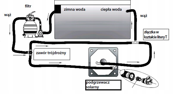 Нагреватель следует подключать к бассейну через систему фильтрации: по одному из шлангов подается холодная фильтрованная вода из фильтра в один из нагревателей. отверстия. Другой шланг отводит нагретую солнечными лучами воду из второго отверстия нагревателя в бассейн. Когда холодная вода попадает в нагреватель, она проходит через змеевик, где нагревается солнечными лучами, а затем возвращается в бассейн.