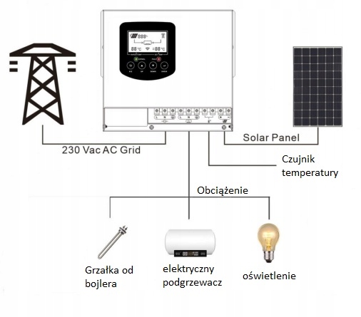 Система проста, требуется всего лишь подключить 8 штук типичных фотоэлектрических панелей последовательно к преобразователю и приемнику энергии к розетке 230 В, например электрический котел, пол с подогревом .