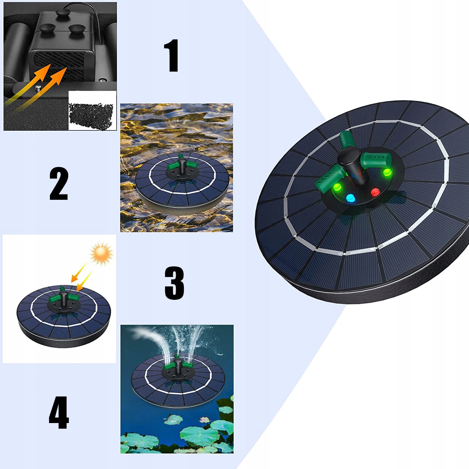 ★ Функция защиты от воды: при отсутствии воды насос автоматически перестанет работать, чтобы защитить двигатель; обратите внимание, чтобы при использовании было достаточно воды: чем сильнее солнце, тем лучше эффект фонтана.