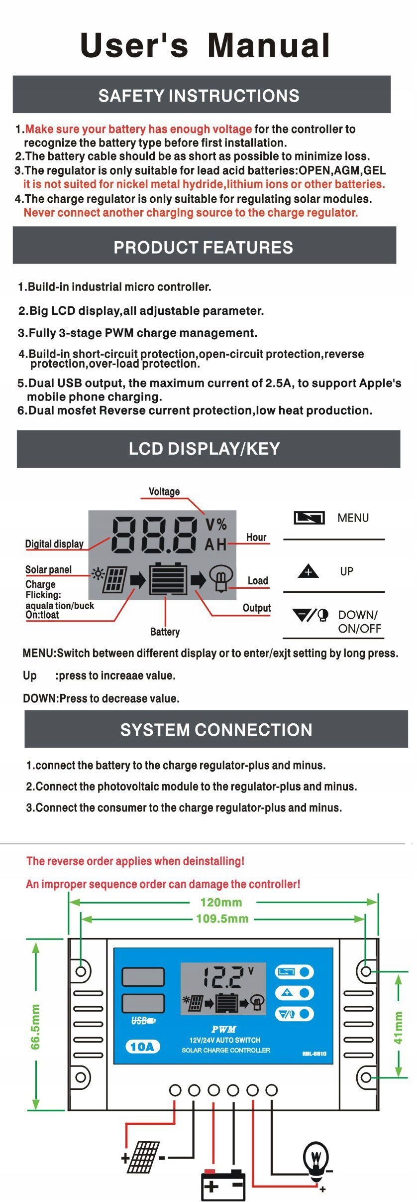 04F10 КОНТРОЛЛЕР ЗАРЯДКИ СОЛНЕЧНОГО РЕГУЛЯТОРА 10A, для фотоэлектрических панелей 12/24 В с ЖК-дисплеем и портами USB