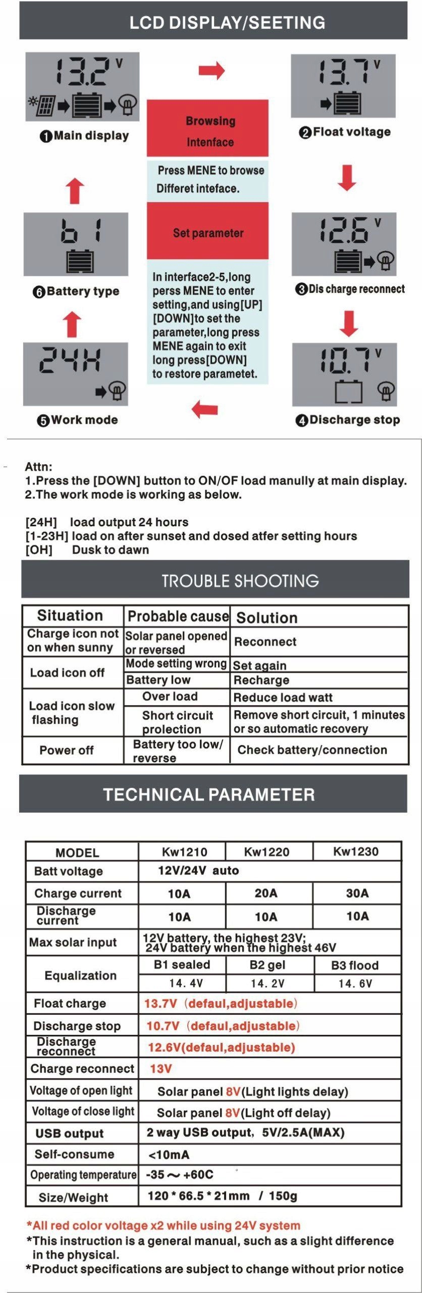 На дисплее контроллера можно наблюдать текущее напряжение зарядки аккумулятора и устанавливать/выбирать режим работы с гелевыми, кислотными и AGM аккумуляторами, а также вручную программировать настройки напряжения переключения выхода и время переключения выхода после наступления темноты.< /п>