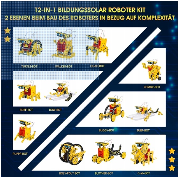 - Солнечный робот 12 в 1. Этот строительный робот имеет 12 различных моделей, предназначенных для перемещения. на земле и воде. Дети в возрасте от 8 до 14 лет могут изучать сборку роботов и различные основные понятия физики, весело проводя время, развивая свои практические навыки и воображение.
