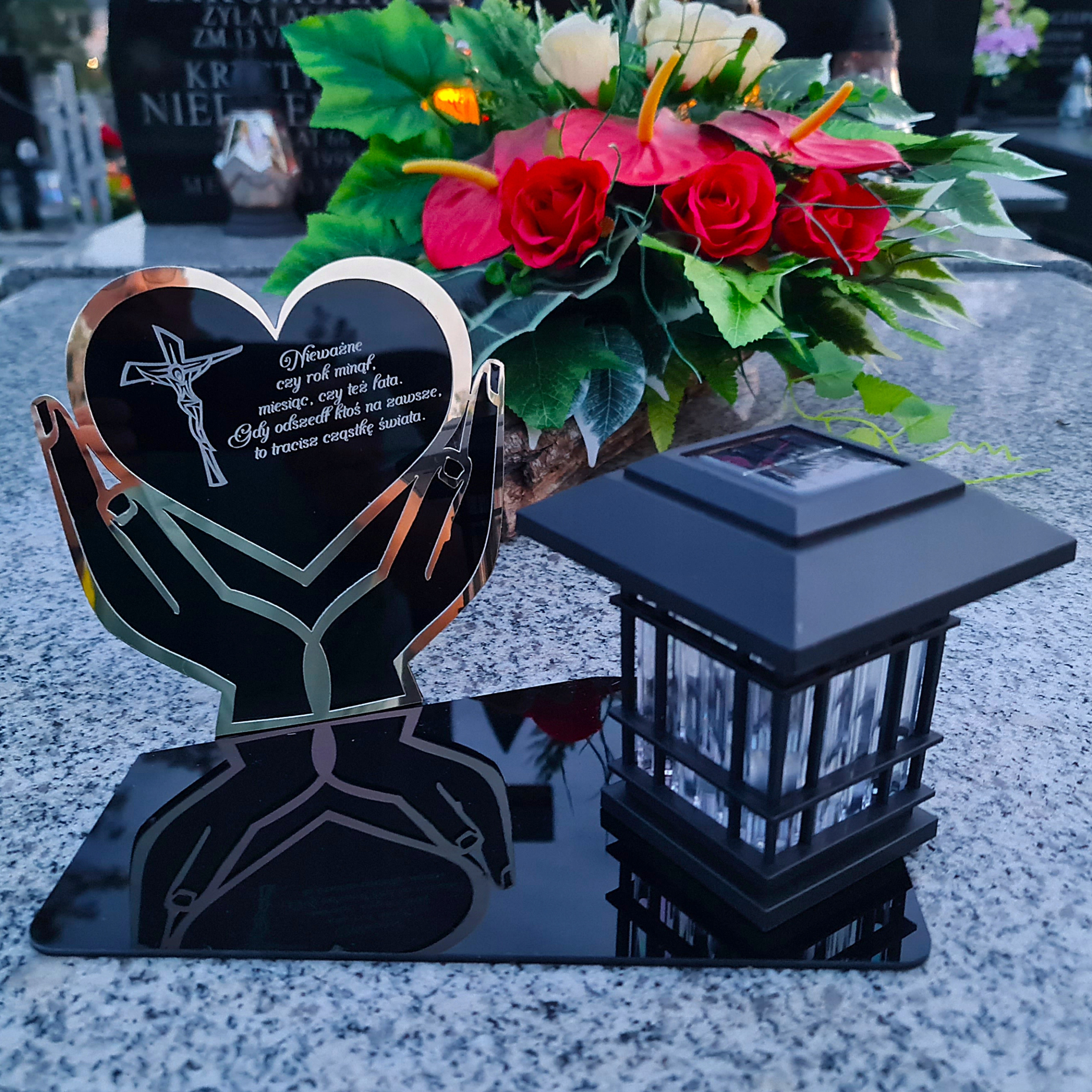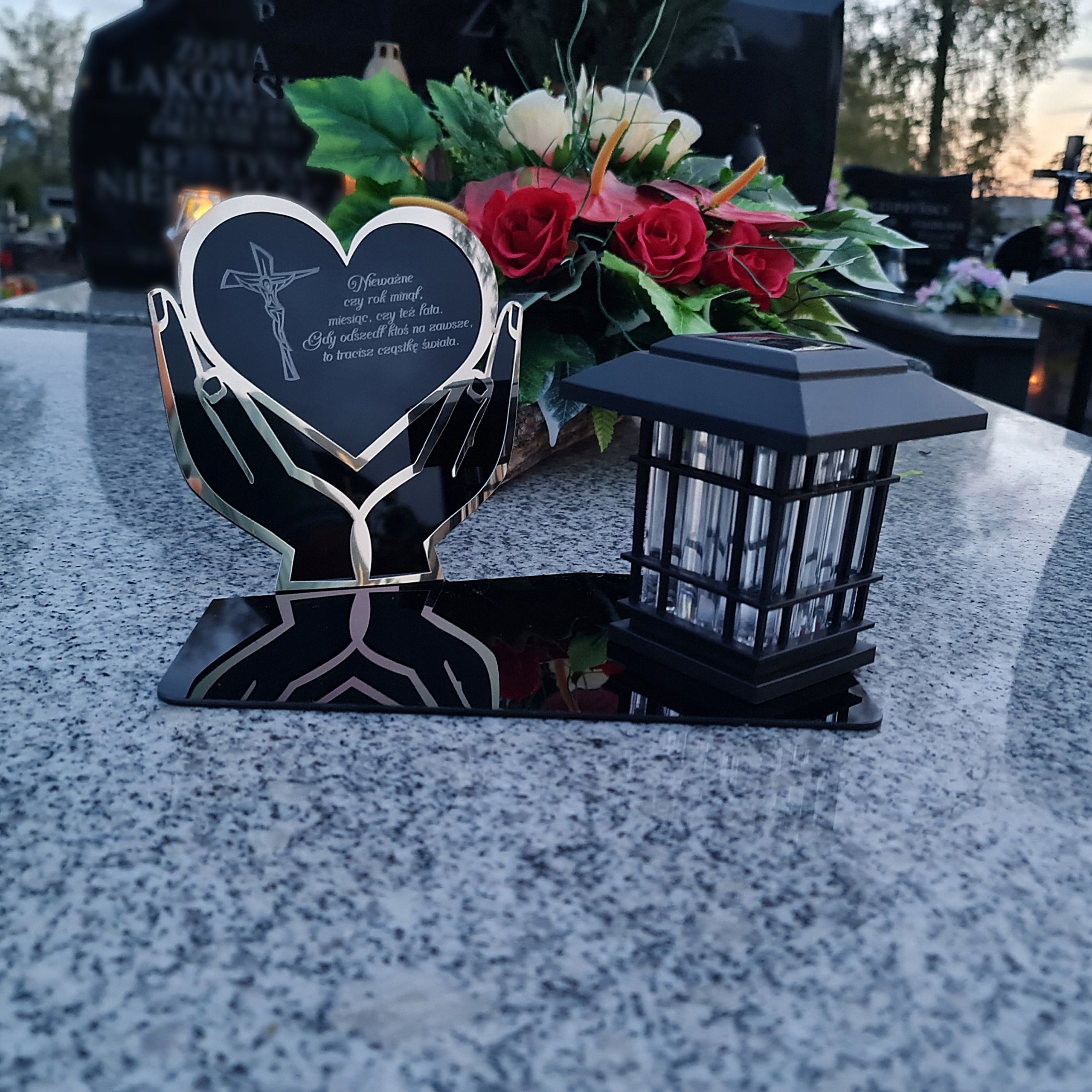 Вечная солнечная свеча для могилы с гравированным акриловым стеклом, украшенным мотивом золотых рук с сердцем