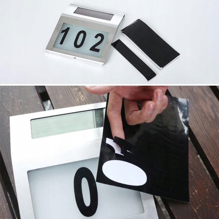 В комплект поставки лампы входит набор самоклеящихся цифр (три листа от 0 до 9) и лист строчных букв (от a до z). Просто наклейте номер на стекло с подсветкой и все! Благодаря высокому цветовому контрасту номер хорошо виден даже издалека.