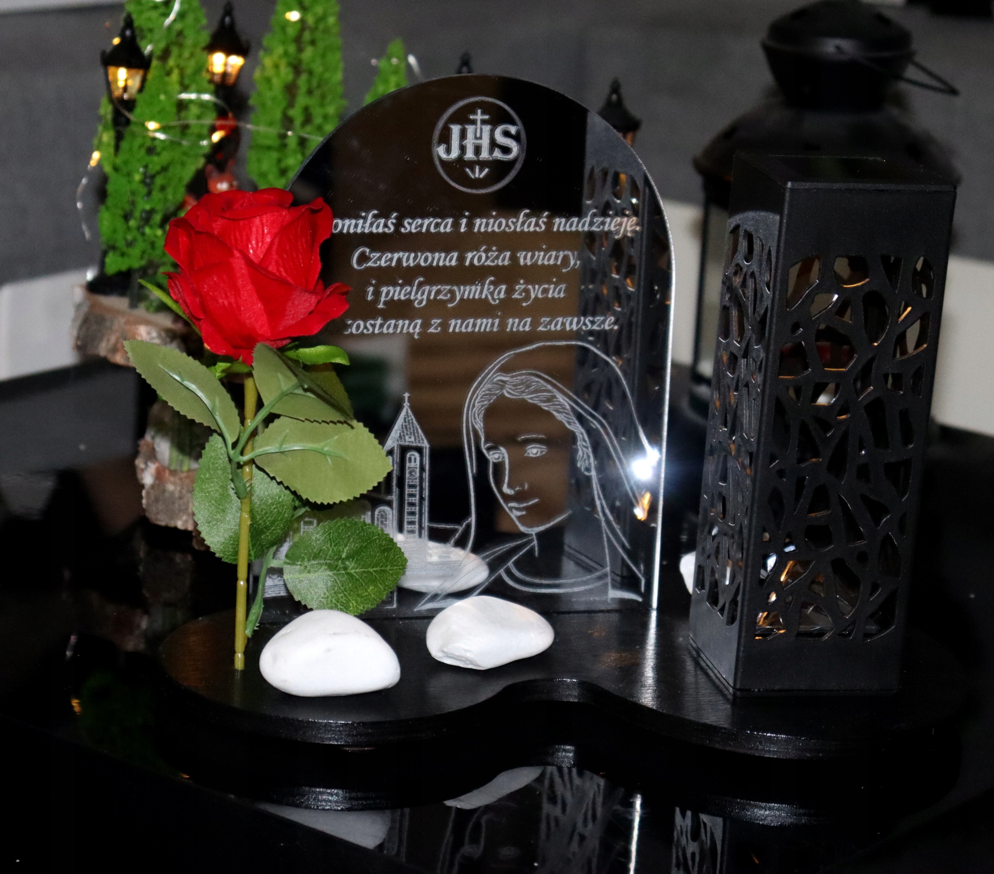 украшение дополняется зеркальной пластиной из плексигласа, на которой мы можем выгравировать любой контент, который добавляет целый уникальный символ. Брзозова, окрашенная в цвет темного дерева. Красная велюра также установлена на подставке, что благодаря его реализму дает уникальность. Это идеальный выбор для могилы для любимого человека, который, благодаря солнечному источнику питания, является техническим и экологическим, и в то же время является прекрасным духовным сувениром. p>