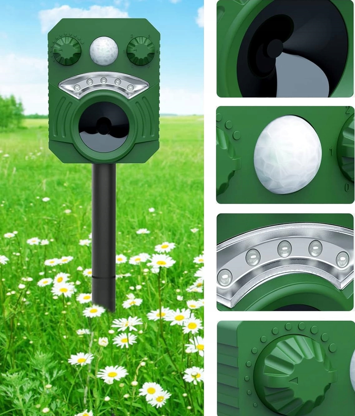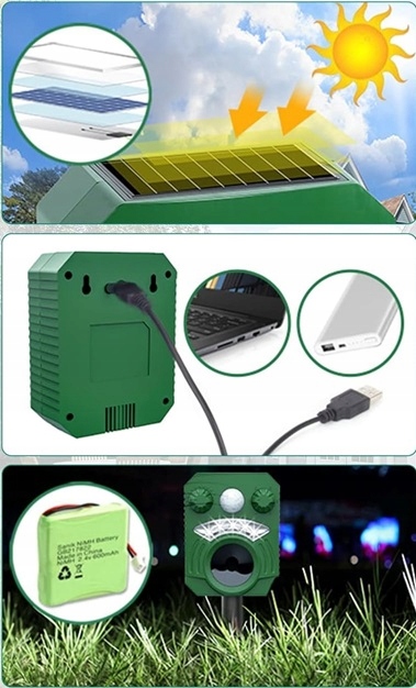 Позаботьтесь о своем дворе, саду или ферме с помощью нашего ультразвукового отпугивателя диких животных. Оснащенный усовершенствованным PIR-датчиком и мощным ультразвуковым динамиком, этот отпугиватель эффективно отпугивает кошек, собак, енотов, куниц, лисиц и многих других нежелательных животных. Благодаря солнечной энергии и дополнительной зарядке через USB устройство надежно работает даже в долгие дождливые дни. Водонепроницаемая конструкция IP44 и регулируемые режимы делают этот отпугиватель идеальным выбором для всех, кто хочет защитить свое пространство безопасным и экологически чистым способом.