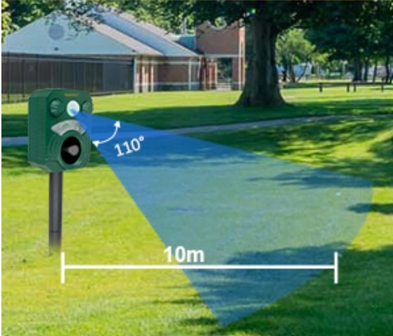 - Интеллектуальный PIR-датчик: Встроенный PIR-датчик движения автоматически обнаруживает присутствие животных в радиусе 110° и активирует устройство, излучающее ультразвук и светодиодный свет, эффективно отпугивая нежелательных животных.