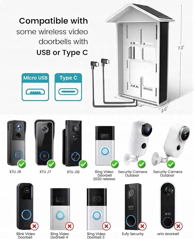 - Универсальная совместимость: солнечное зарядное устройство, подходящее для устройств с батареей, которые поддерживают интерфейс Micro USB. Например, Ring Video Doorbell 2020 Release, Xtu J1, J7, J7C, J7Plus Video -Intercom и камера безопасности (с Micro USB -портом Micro Logging). Такие как J1/J7/J7C/J7Plus/J9/J9K/J10/J10PLUS -видео -интерком и камера безопасности (с портом Micro USB)