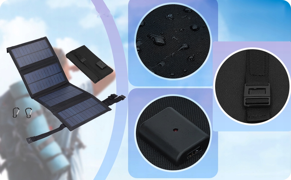 Поверхность этого портативного солнечного зарядного устройства с емкостью 20 Вт изготовлена из прочной оксфордской ткани, которая является водонепроницаемой, устойчивой к общепризнанному, солнцу и плесени, так что вы можете использовать ее снаружи.