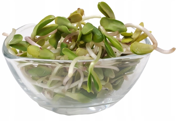 Проростки подсолнечникаимеют нежный, ореховый вкус. Это делает их прекрасным дополнением ко многим кулинарным блюдам. Они обеспечивают организм фосфором и кальцием, т. е. минералами, укрепляющими кости и зубы, а также железом, необходимым для процесса кроветворения. Кроме того, они также содержат магний, калий, медь и цинк. Вегетарианцам, склонным к дефициту этих элементов, следует включать их в свой рацион.Проростки подсолнечника обеспечивают организм витамином D, который очень редко встречается в растениях, а также большое количество белка и ненасыщенных жирных кислот. Они положительно влияют на обмен веществ, особенно жиров и углеводов.