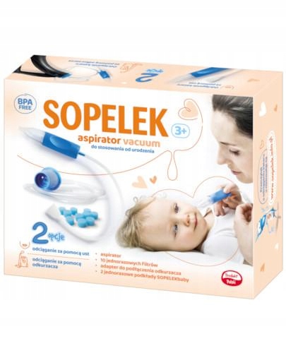 Вакуумный аспиратор Sopelek3 — комплект, позволяющий эффективно и безопасно удалить застрявшие в носу у ребенка выделения. В комплект поставки входят запасные фильтры, адаптер для пылесоса и одноразовые водонепроницаемые медицинские прокладки для детей