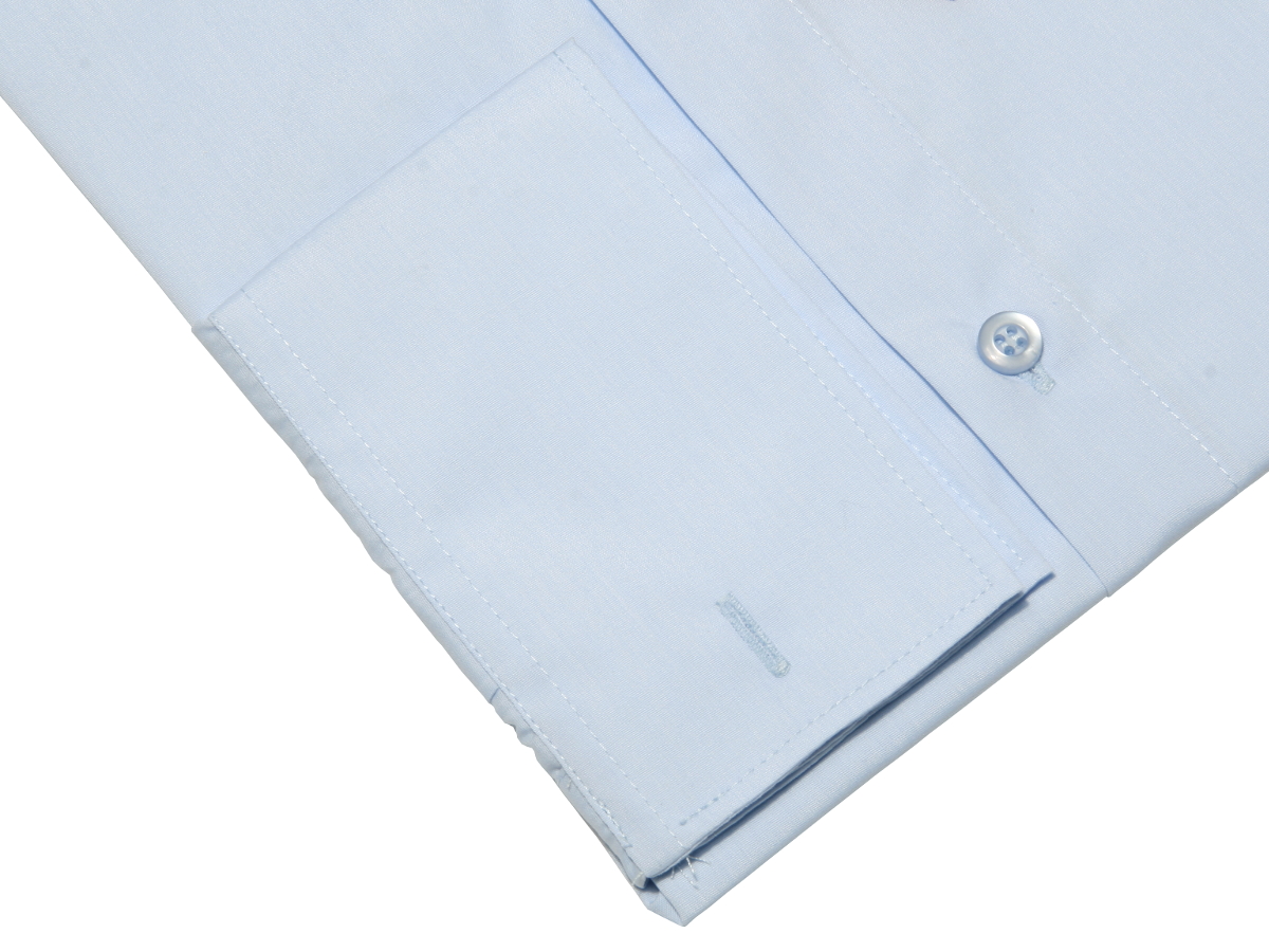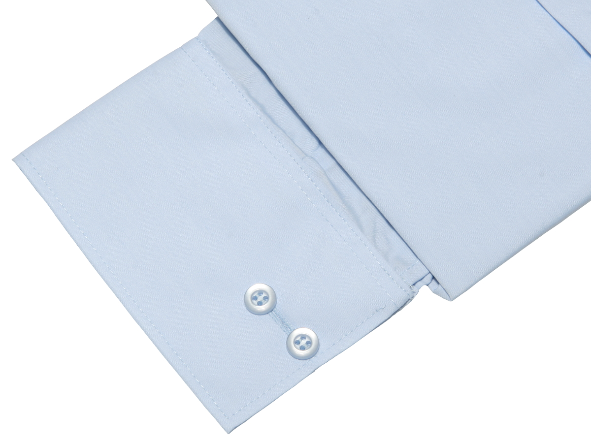 Однотонная синяя рубашка высочайшего качества с длинными рукавами и манжетами, застегивающимися на запонки и пуговицы.