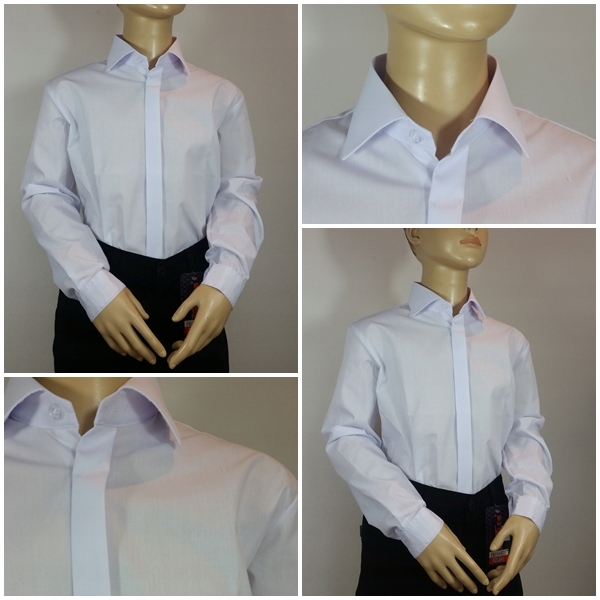 Предмет аукциона — элегантная белая рубашка для мальчика с длинными рукавами, застегивающаяся на обтянутые пуговицы.