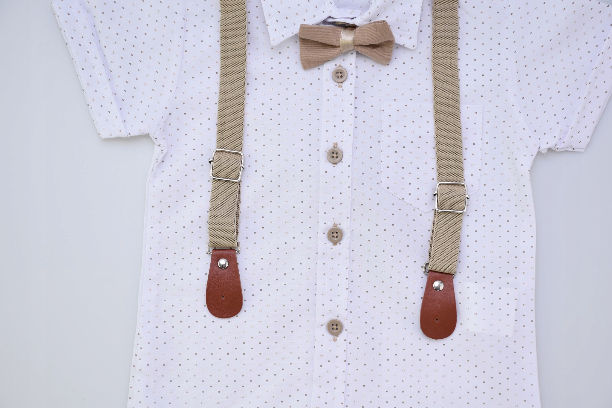 - Белая рубашка с бежевым узором, прикрепленная бежевыми кнопками. Рубашка имеет короткий рукав, воротник и карман спереди.