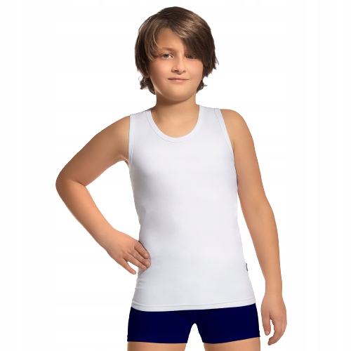 Однотонная белая футболка без рукавов для мальчика из высококачественного натурального хлопка. Футболка имеет круглый вырез горловины и двойные швы на стыках материала. Это чрезвычайно комфортное нижнее белье для мальчиков, нежное к коже. Идеально подходит для многих торжеств.