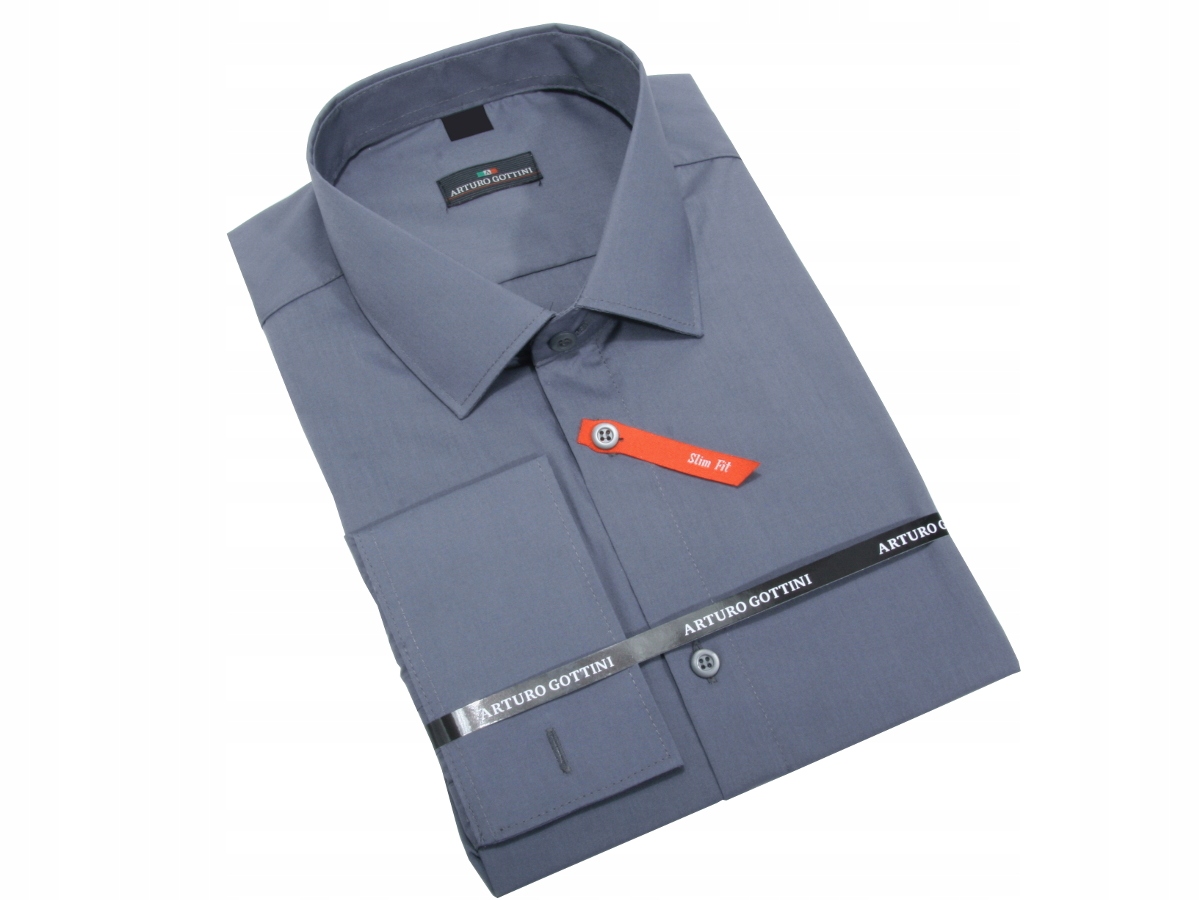 Рубашка графитового цвета высочайшего качества, однотонная, с длинными рукавами и манжетами, застегивающимися на запонки и пуговицы.