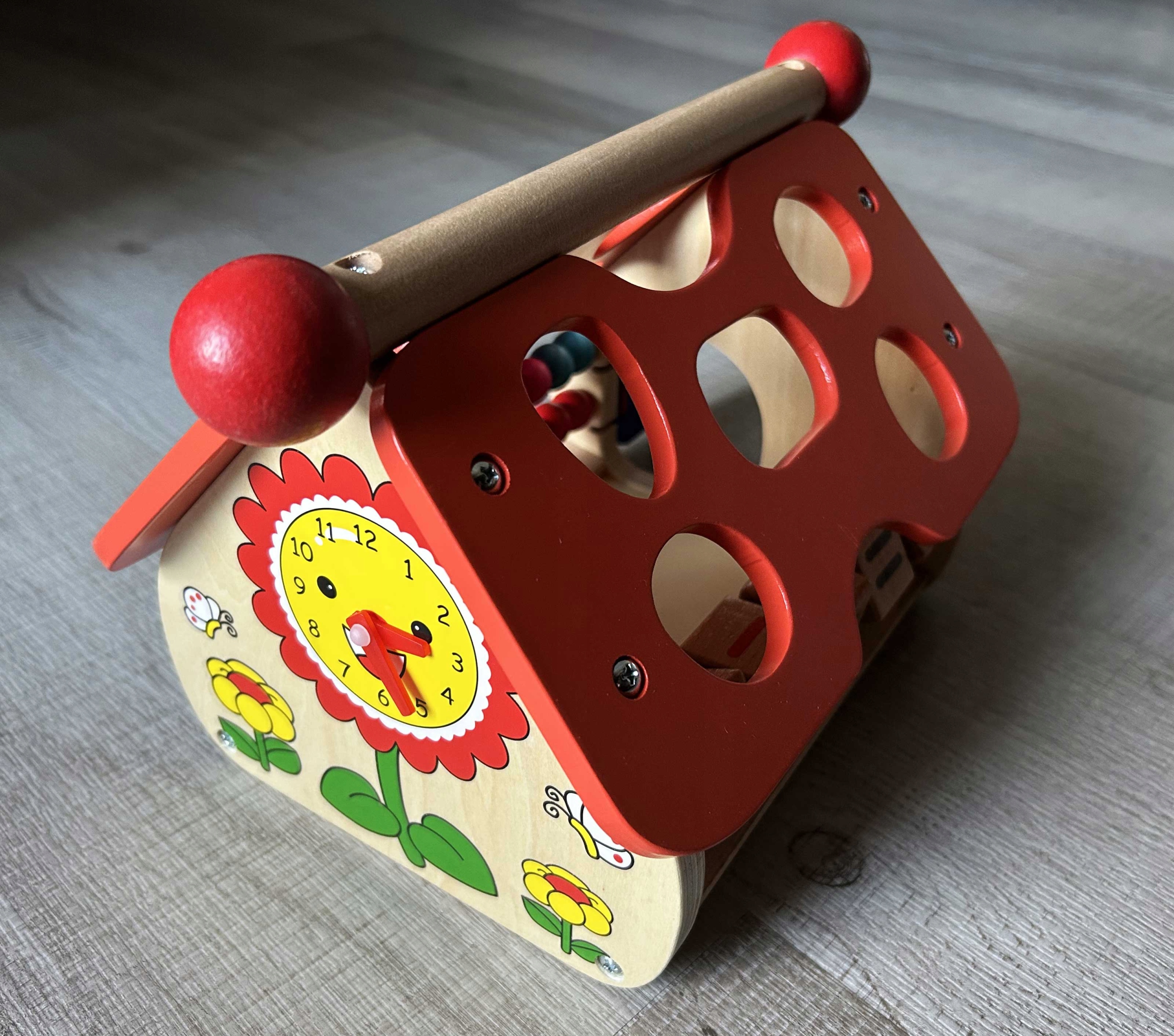 Эта игрушка сочетает в себе 5 различных занятий в одном: сортировщик фигур, обучение времени, нанизывание бус, счеты и базовое обучение математике