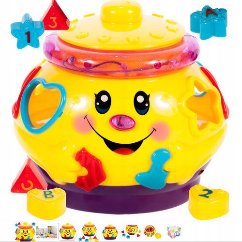 Каждый горшок содержит 6 кубиков, которые помогают изучать формы, сопоставляя их с соответствующими отверстиями в горшке. Блоки можно вынуть через отверстие под крышкой.