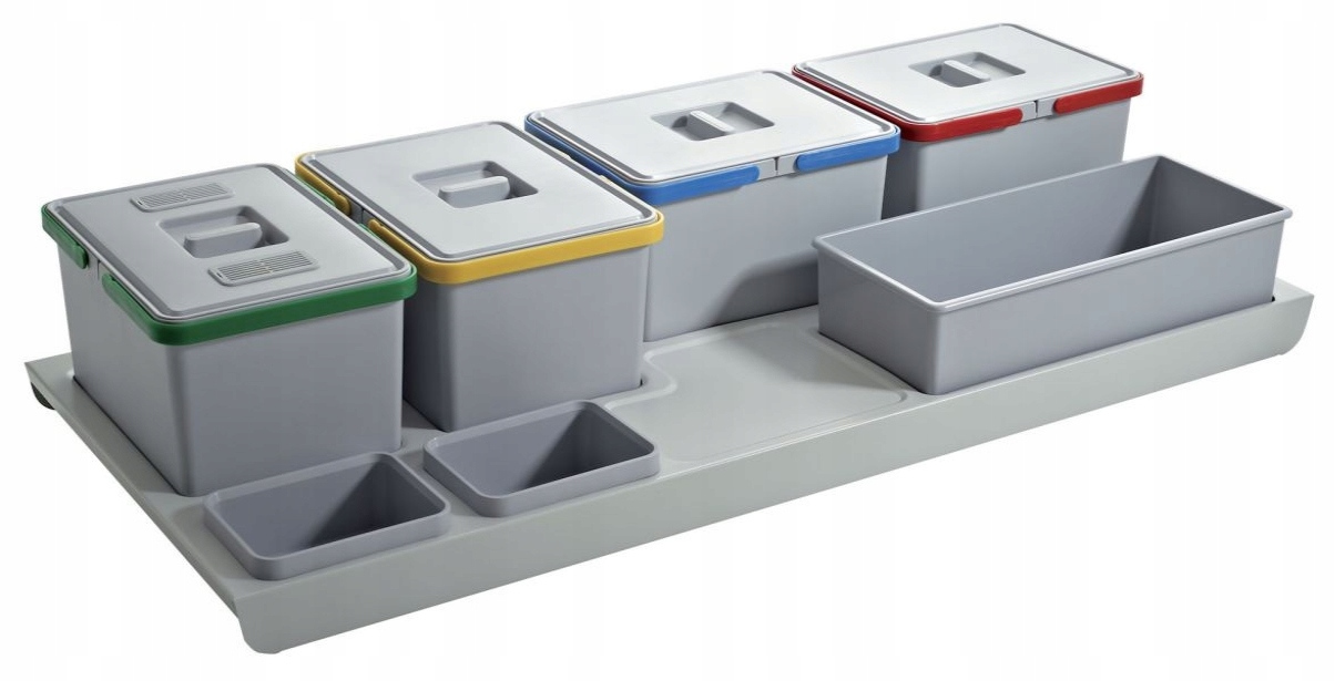 - четыре высококачественных пластиковых контейнера серого цвета с цветными полосами (красными, синими, желтыми и зелеными), облегчающими сортировку мусора.