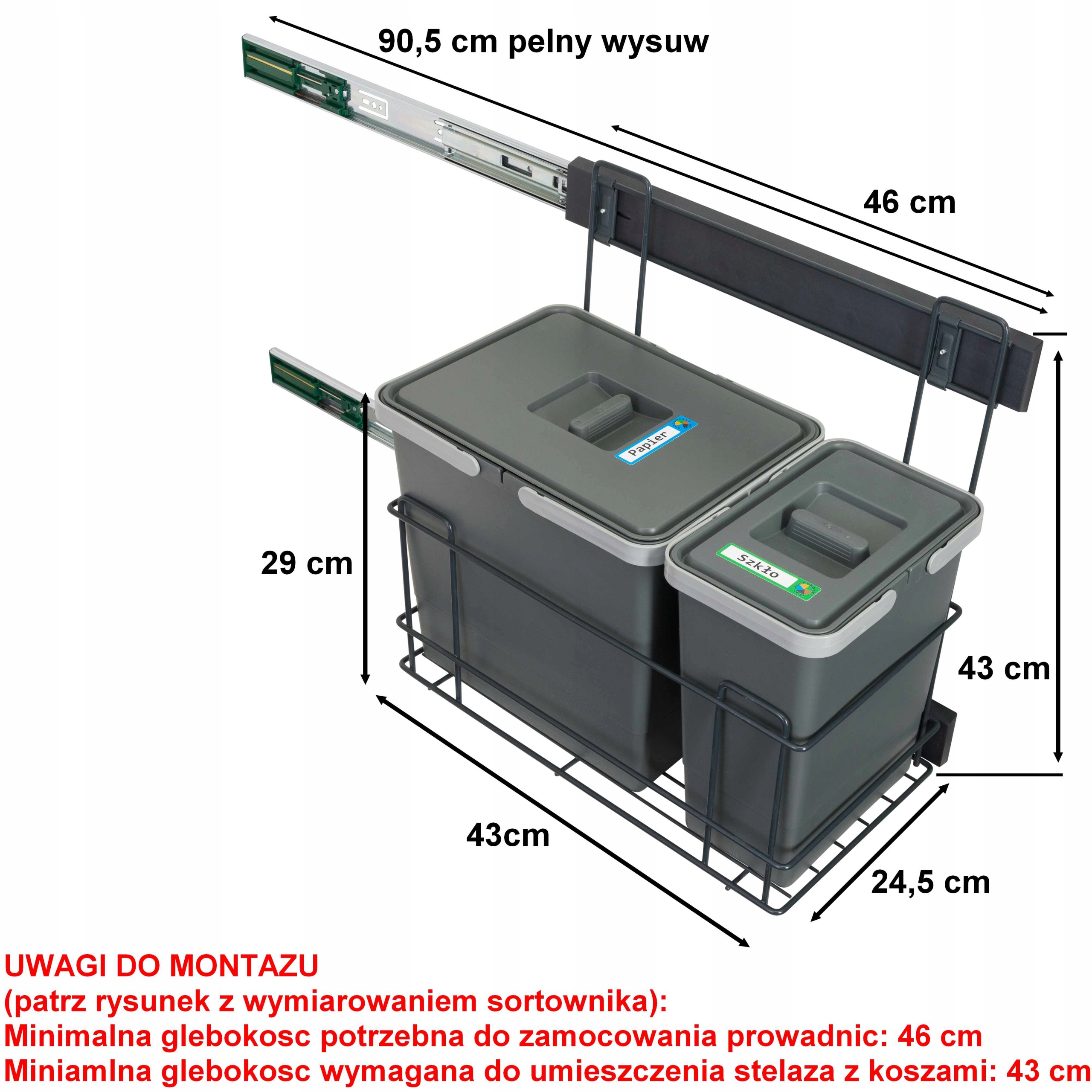 Комплект состоит из трех корзин с крышками, стальной рамы, и качественные направляющие с функцией полного выдвижения и бесшумного закрытия, крышкой направляющей и набором креплений.