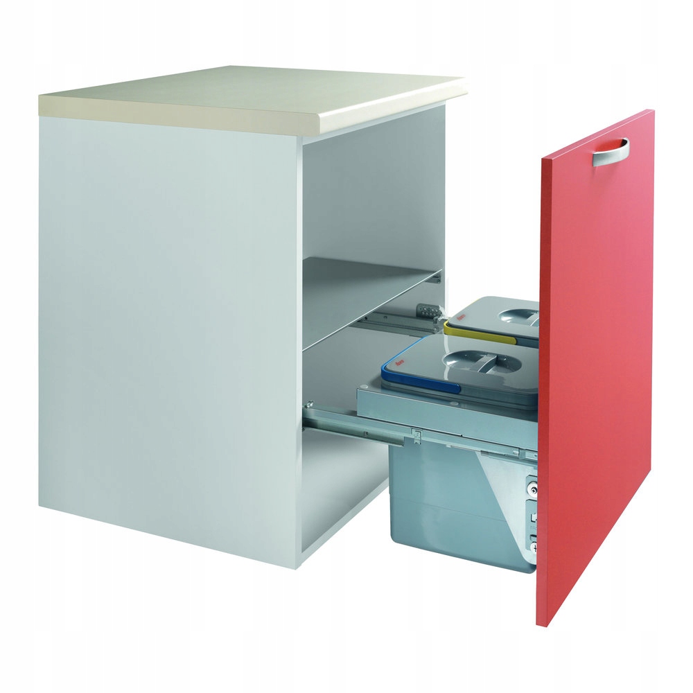 Встроенный сортировщик мусора. Установка в шкаф шириной 60 см с беспетлевыми дверцами – открывание «ящик». 2 контейнера по 15л. Контейнеры с цветовой маркировкой. Стальные направляющие грузоподъемностью до 50 кг. Контейнеры легко снимаются. Встроенная высота: 290 мм.