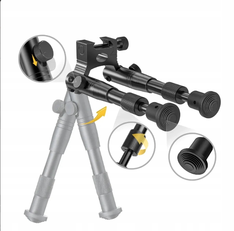 ✔️ Сошки из алюминиевых сплавов с телескопическими ножками, длина которых регулируется от 21,5 см до 25,5 см, благодаря использованию телескопической системы изменения положения ножек от отдых в использовании очень быстрый и плавный.