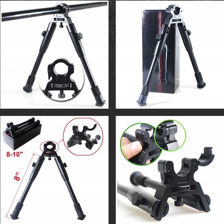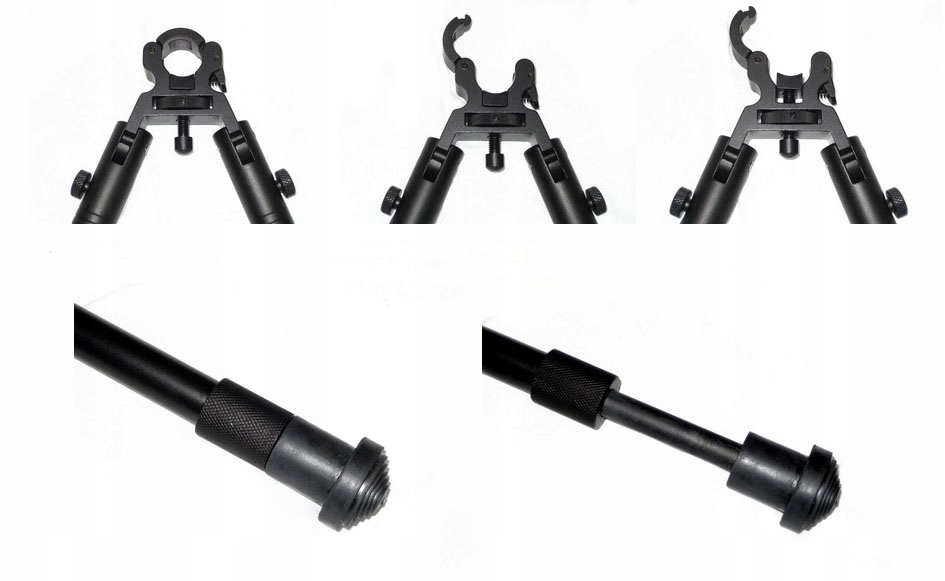 Изготовлен из алюминиевых сплавов. Оснащен резиновыми подножками, регулируется по стволу (отверстие регулируется от 11 до 19 мм), пружинными ножками. Сошки имеют обойму, позволяющую осуществлять быструю сборку и разборку на стволе. Сборка тоже не займет больше нескольких секунд.