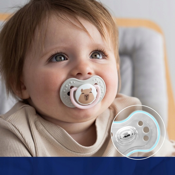Динамическая соска, благодаря своим свойствам уникальная силиконовая структура разной толщины растягивается и сжимается в зависимости от ритма сосания ребенка. Благодаря этому он защищает его сосательный рефлекс и не оказывает негативного влияния на грудное вскармливание. Ластик имеет симметричную форму, вдохновленную формой соска, наполненного молоком, что обеспечивает ребенку привычное ощущение, подобное ощущению груди.