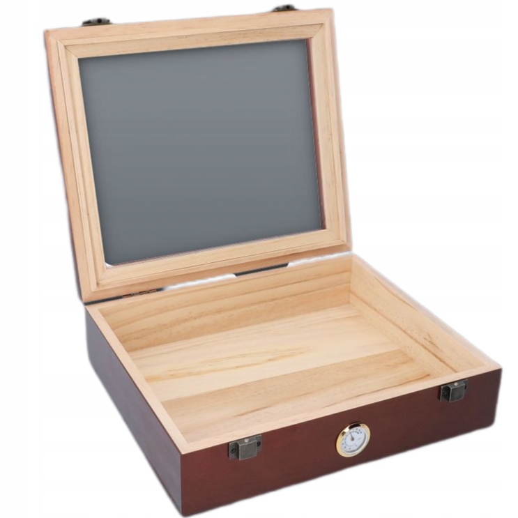 Деревянная коробка для сигар, необходимая каждому курильщику сигар. Обеспечивает защиту табака от высыхания и разрушения. Изготовлен из дерева, петли металлические. Элегантный, простой. Оснащен гигрометром и дополнительно остеклен, чтобы можно было наслаждаться сигарами.
