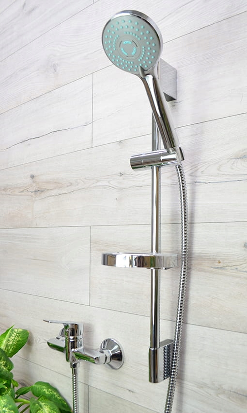 Удобная стальная штанга для душевых наборов с регулируемым держателем душевой лейки в современном стиле, обеспечивающая возможность направлять струю воды с нужной высоты как во время принятия душа, так и в ванне.