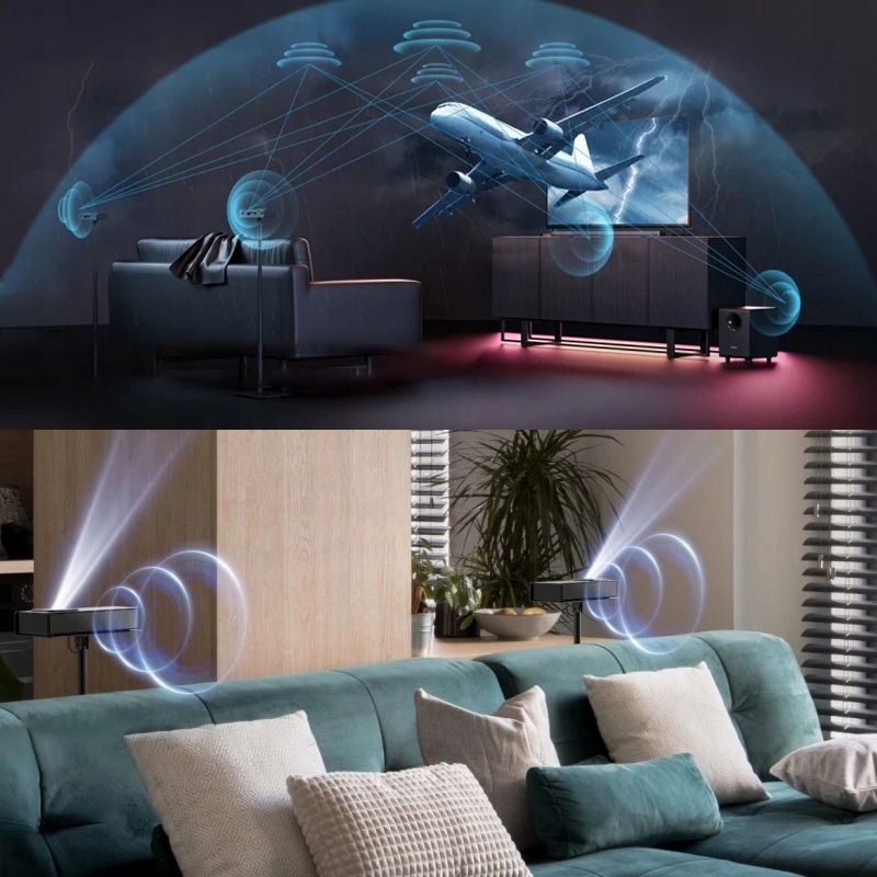 Эта звуковая панель оснащена 4 преобразователями, направленными вверх, которые умно отражают и отвлекают звук равномерно по всей комнате, обеспечивая точное местоположение и рендеринг звука, основанный на местоположении и направлении источника звука. В руках с двумя улучшенными беспроводными задние динамики, которые можно разместить в любом месте, благодаря тому, что звук более многоуровневый и создает многонаправленное и привыкающее звуковое впечатление.
