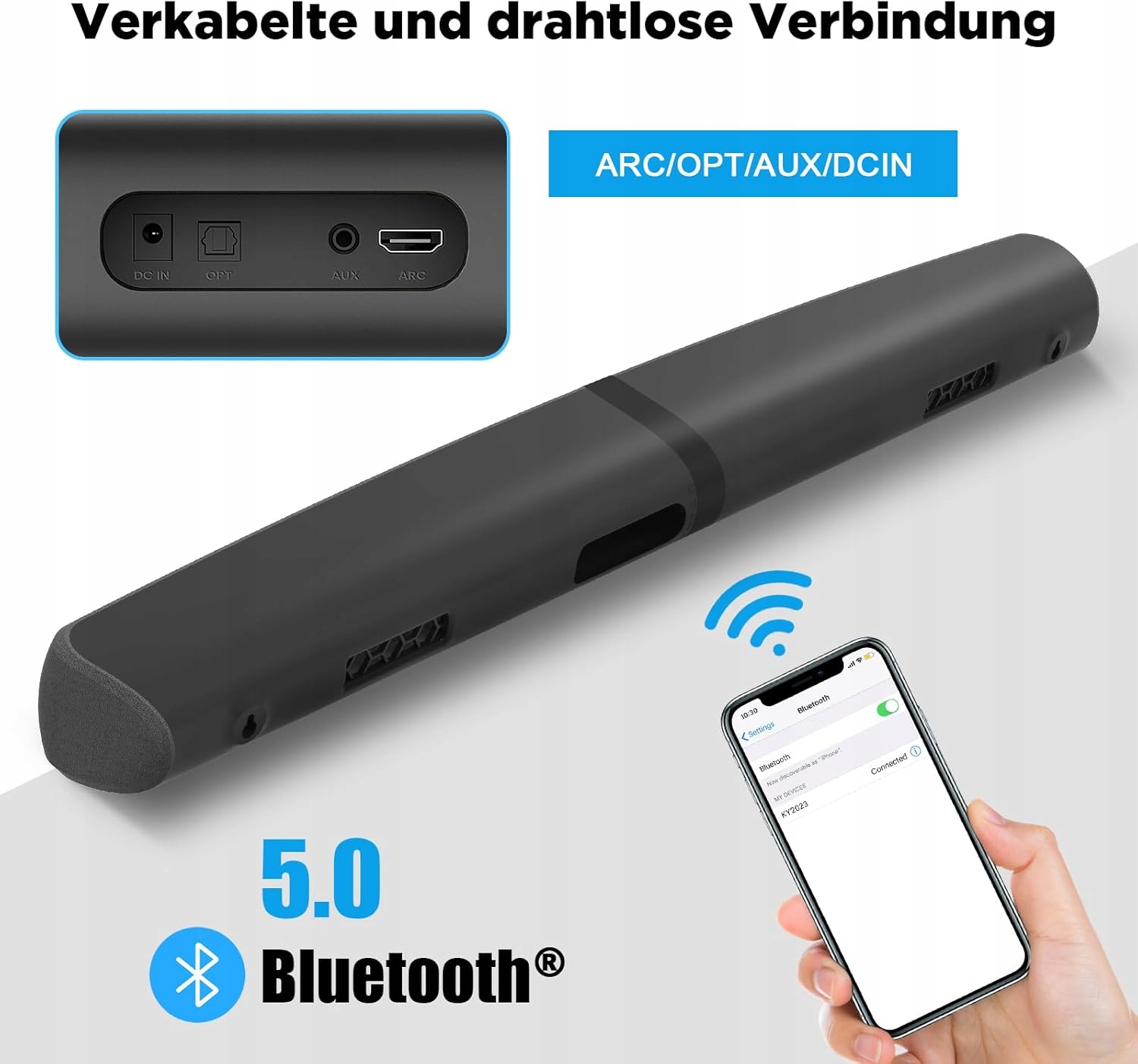 - [ Easy Installation] : подключите без усилий с Bluetooth 5.0 для удобства беспроводной связи или используйте Arc, Opt и AUX -кабели, чтобы получить стабильное проводное соединение. Управляйте звуковой панелью с помощью телевизора дистанционного управления в дуге. Наши подробные инструкции и видеоуроки обеспечивают несложную конфигурацию, поэтому вы можете быстро насладиться идеальным звуком.