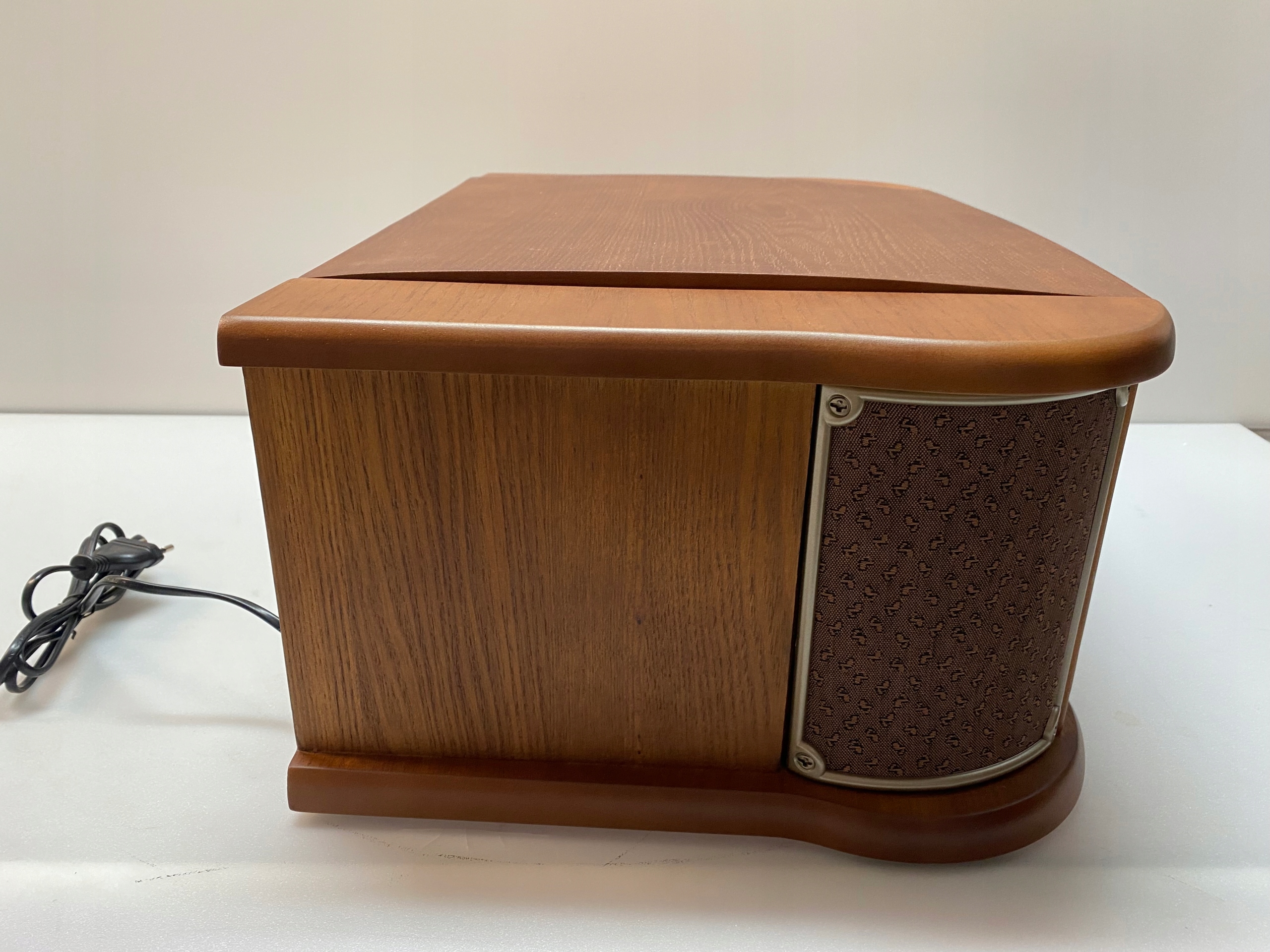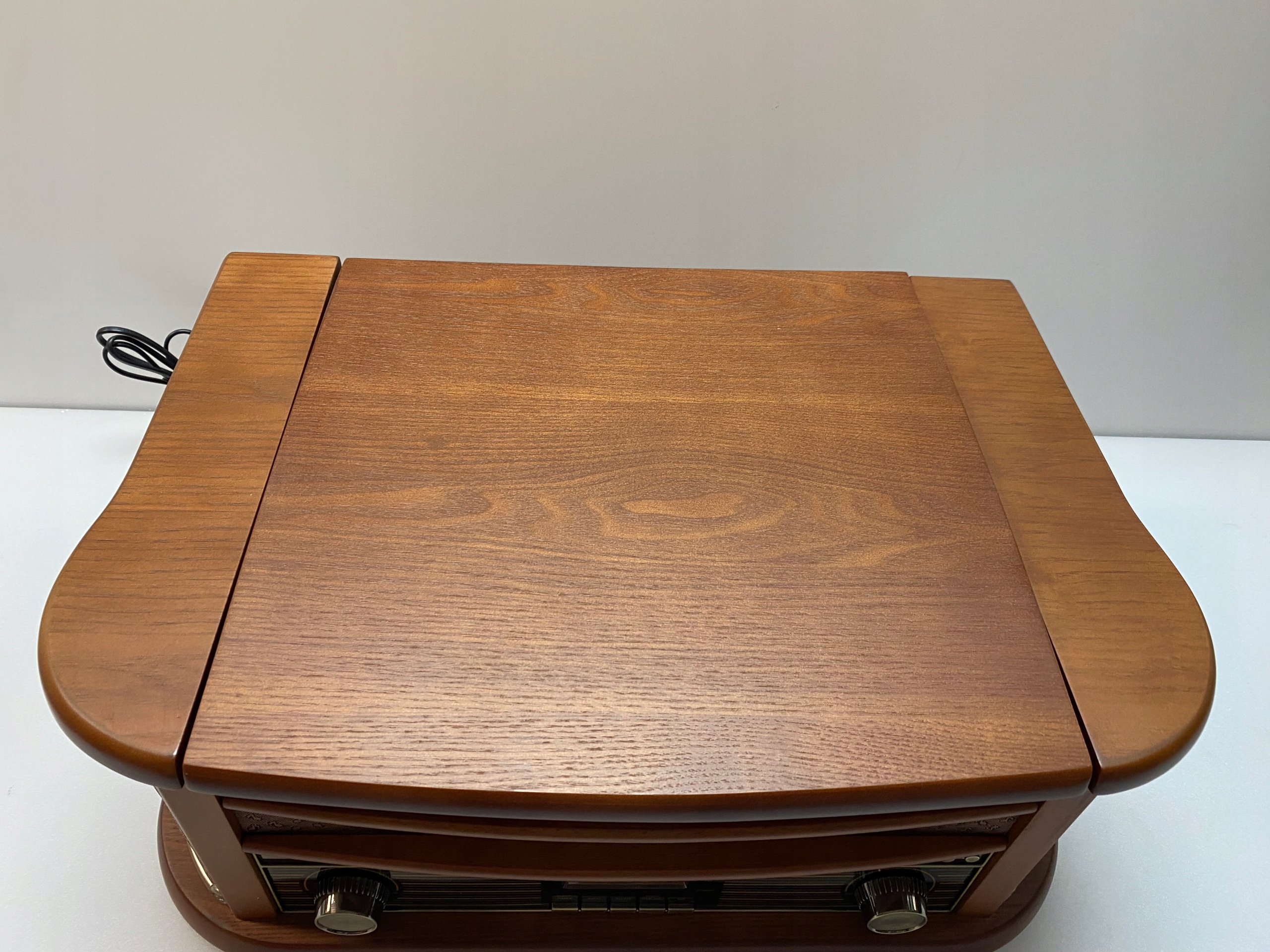 два интегрированных громкоговорителя 5W и стабильный деревянный корпус обеспечивает приятный звук. Большие ручки и кнопки спереди, а также основание ЖК -дисплея облегчают работу устройства.