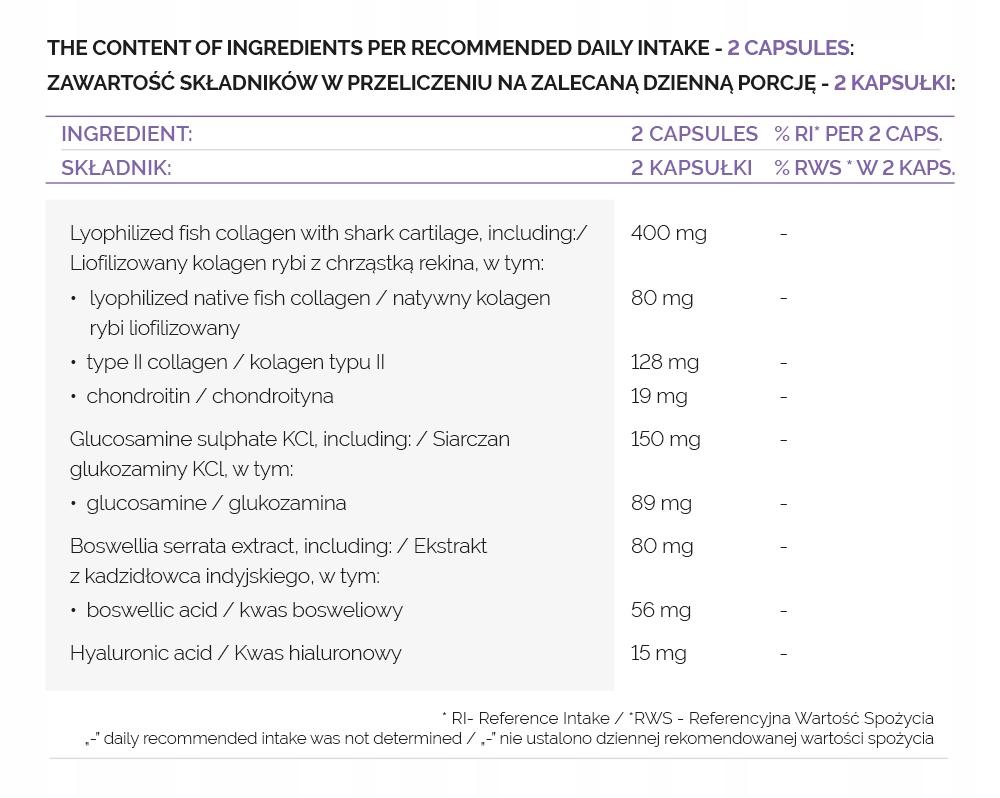 Храните в сухом месте при комнатной температуре. Защитите от света. Хранить недоступно для маленьких детей. Не превышайте рекомендуемую часть для потребления в течение дня. Диетическая добавка не может быть использована в качестве замены разнообразной диеты. Рекомендуется устойчивая диета и здоровый образ жизни. 2 KCL ракообразных, капсула (бычий глатин), индийский экстракт ладана (Boswelia serrata), гиалуроновая кислота