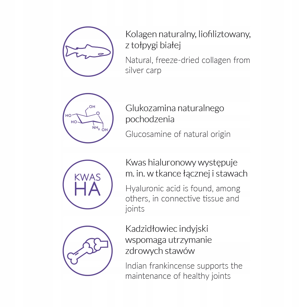 для суставов -это пищевая добавка, содержащая комбинацию четырех ингредиентов, влияющих на функционирование аппарата для движения: инновационный комплекс, привязанный к нативным рыбным коллагеном с акулой хрящ, глюкозососом, гиалуроновой кислотой и Индийский экстракт. На что его аминокислоты остаются нетронутыми в химических терминах, тем самым сохраняя его первоначальные, естественные свойства