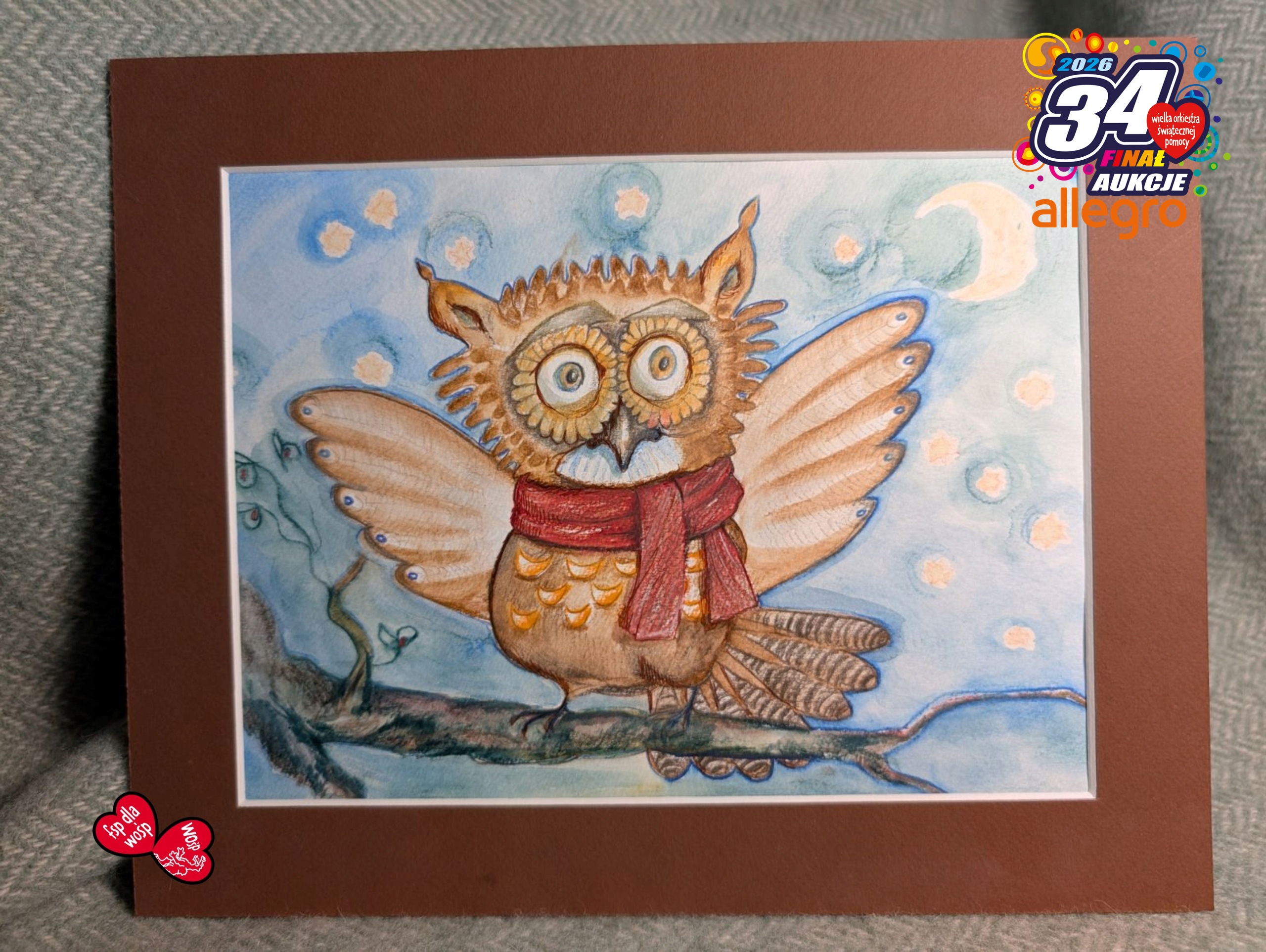 Картина идеальна для детской комнаты. Сова расправляет крылья на фоне звездного неба. Птица приглашает вас в волшебный полет в страну грез, где на каждой ветке зимнего леса можно встретить лесных зверей с шарфами на шеях. Работа Евы Хмелевской, человека многих талантов, выполнена в технике акварели. Размеры картины (с учетом паспарту) 30х24 см.