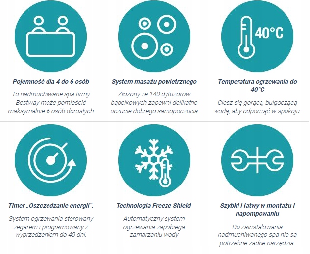 Инновационный надувной спа-центр LAY-Z SPA RIO оснащен функцией автоматического подогрева Freeze Shield. Эта инновационная технология, разработанная специально для BESTWAY, активируется без малейшего вмешательства с вашей стороны, как только вода в вашем спа-центре упадет ниже 4°C, чтобы предотвратить замерзание воды. Для этого просто оставьте насос включенным. Эта функция особенно интересна, если вы хотите пользоваться спа круглый год. Если вы не планируете в нем отдыхать зимой, рекомендуем хранить его строго по инструкции в руководстве пользователя.