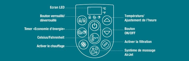 Оснащенный новым цифровым интерфейсом, технический блок надувного джакузи LAY-Z SPA RIO позволит вам надуть конструкцию вашего спа, активировать его фильтрацию систему, нагревать воду и даже активировать 140 пузырьковых диффузоров этой гидромассажной ванны BESTWAY. Эти различные функции можно активировать непосредственно с панели управления наклоном, расположенной в верхней части блока. Благодаря этому вы сможете в любой момент контролировать температуру вашего бассейна с помощью светодиодного экрана и управлять различными функциями вашего спа, не выходя из воды.