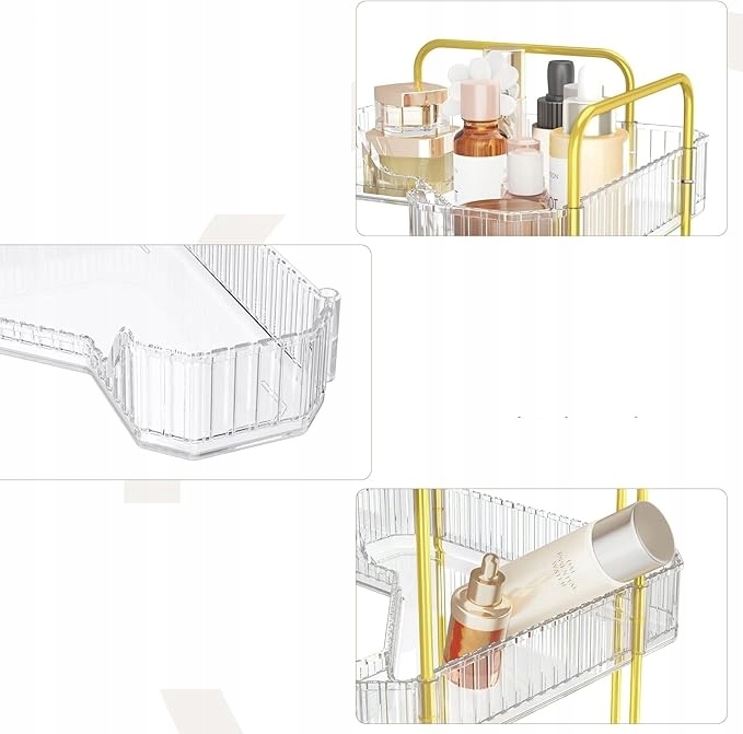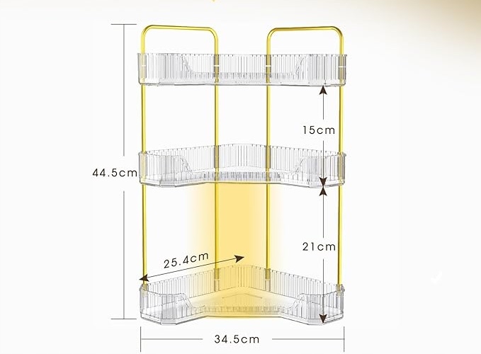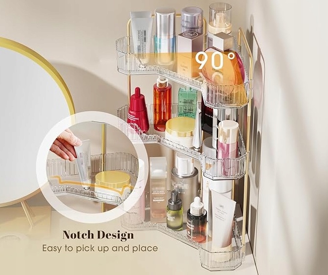Размер и форма: органайзер для ванной комнаты спроектирован под углом 90 градусов, чтобы лучше использовать пространство в углу. Трехуровневая конструкция обеспечивает двойное пространство для хранения средств ежедневного ухода за кожей, духов, лосьонов, туши, подводки для глаз, карандашей для бровей, палитры теней для век и другой ежедневной косметики. Содержите туалетный столик в чистоте и порядке.