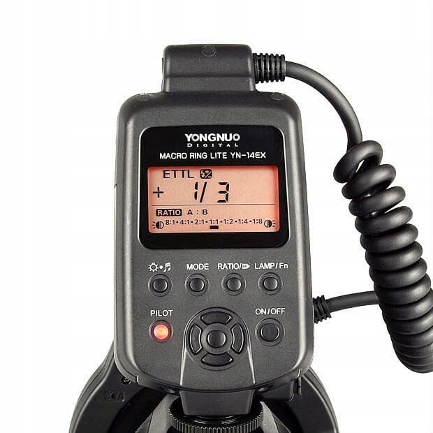 Разработанная для системы Canon YN-14EX, она также может управляться непосредственно из меню камеры (если камера имеет такие функции). Работу в сложных условиях освещения облегчат два LED диода, поддерживающие систему автофокусировки. Лампа состоит из блока управления, помещенного в горячий башмак камеры, и круглой горелки, прикручиваемой к объективу с помощью переходников, входящих в комплект. ЖК-дисплей облегчает управление лампой и выбор соответствующих параметров. Гибкий кабель, соединяющий блок управления с кольцом, позволяет удобно настраивать лампу на различные линзы. В комплект лампы входят четыре резьбовых переходника диаметром 52 мм, 58 мм, 67 мм. > и 72 мм.