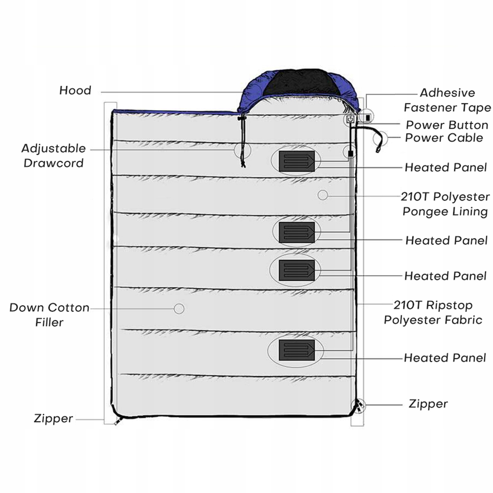 - Этот спальный мешок изготовлен из непромокаемого полиэстера, имеет мягкую подкладку из полиэстера и хлопкового наполнителя, что позволяет сохранять тепло на открытом воздухе. Подключенный к аккумулятору энергии, этот спальный мешок быстро нагревается и распределяет тепло, увеличивая тепло. Регулируемые температурные режимы могут удовлетворить различные требования. Этот спальный мешок — действительно отличный выбор для тех, кто любит походы, походы и походы этой зимой.