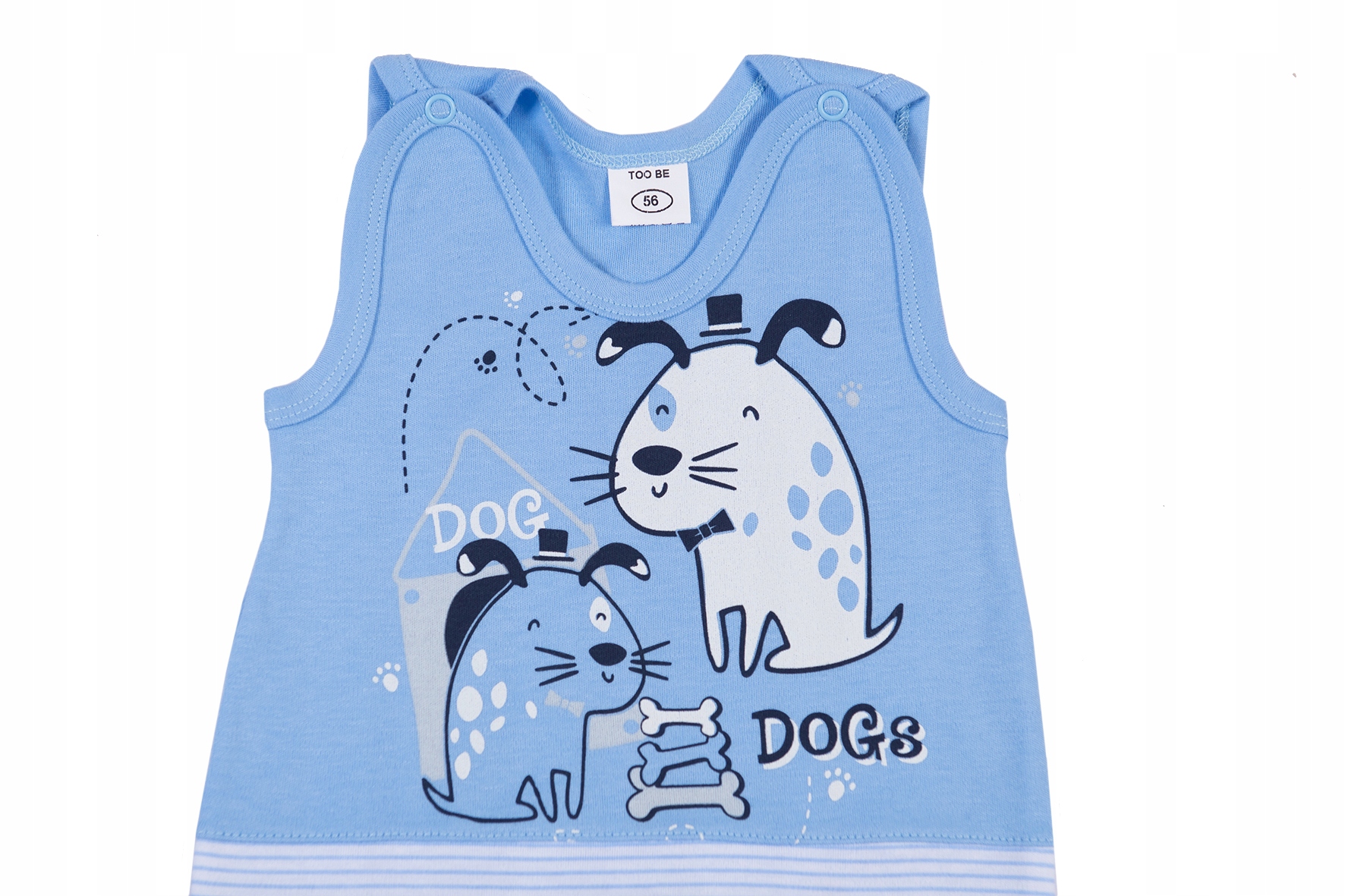 Удобный спальный мешок для мальчика в синем. В разгар груди есть декоративная трафаретная печать в забавной форме собак с надписью «собаки». На высоте ремня ремешок был сшит полосками, напечатанными полосками, имитирующими брюк. Используемый отпечаток состоит из других элементов коллекции "собаки".