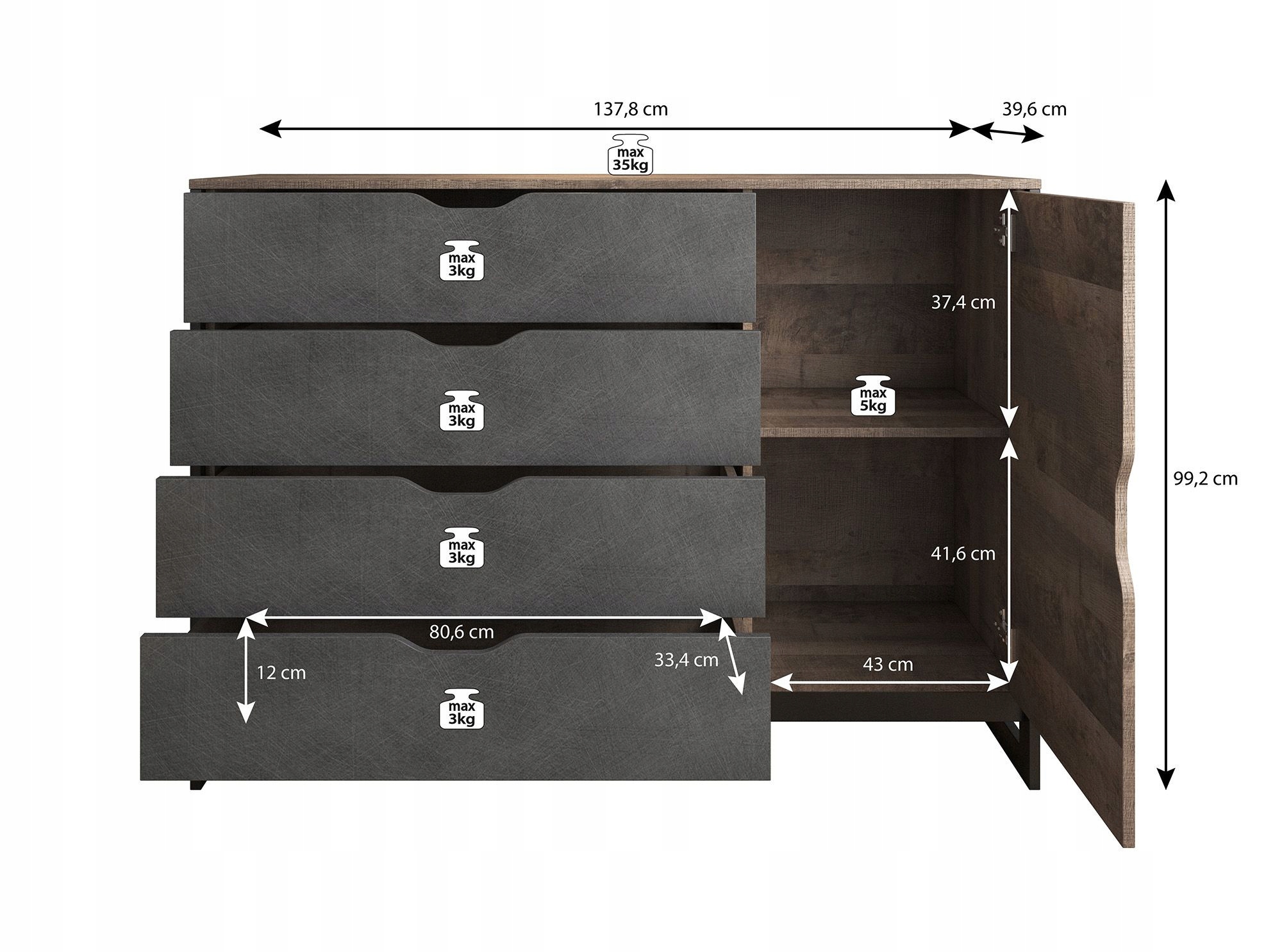 - · Комод оснащен четырьмя широкими ящиками на шариковые направляющие полного выдвижения;