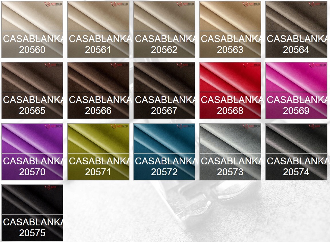 Касабланка мягкая и приятная на ощупь ткань. Этот материал напоминает плюш со слегка мерцающим покрытием. Он долговечен, обладает гидрофобными и огнезащитными свойствами. Материал обладает высокой устойчивостью к царапинам и шерсти домашних животных. Сертификат PETPROOF подтверждает, что волосы не застревают между нитями утка и основы, поэтому их можно легко удалить с поверхности материала с помощью ткани или одежного валика. Ткань покрыта специальным покрытием CLEANABOO. Благодаря ему жидкость удерживается на поверхности ткани. Это позволяет легче содержать ткань в чистоте и удалять загрязнения.