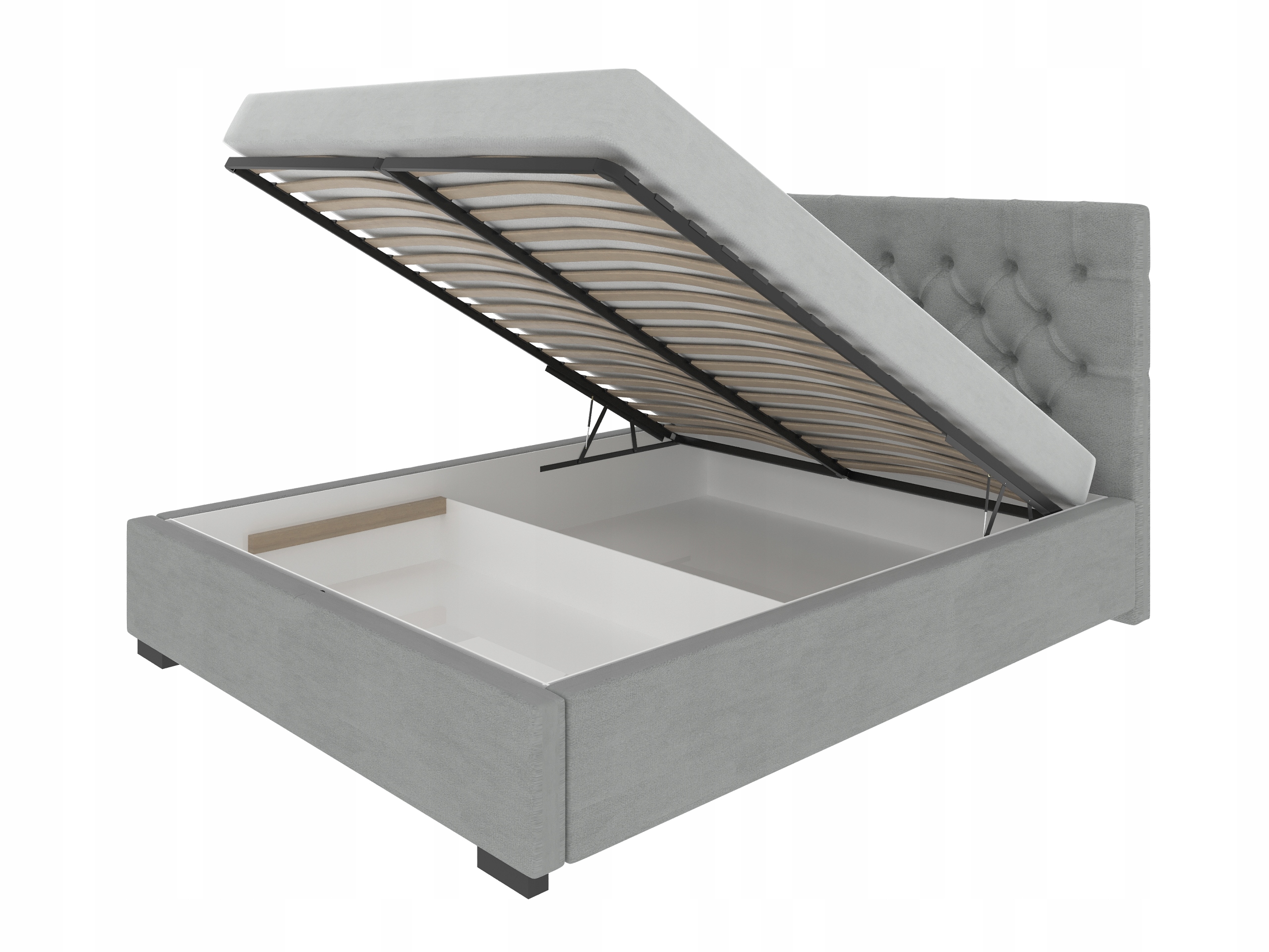 - кровать имеет контейнер для постельных принадлежностей, оборудованный газлифтом и металлическим каркасом. б> с 36 деревянными рейками,