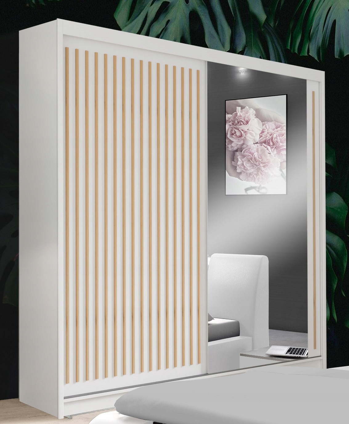 Имеет пару раздвижных и бесшумных дверей, украшенных зеркалом и белым фасадом с планками цвета ВОТАН.
